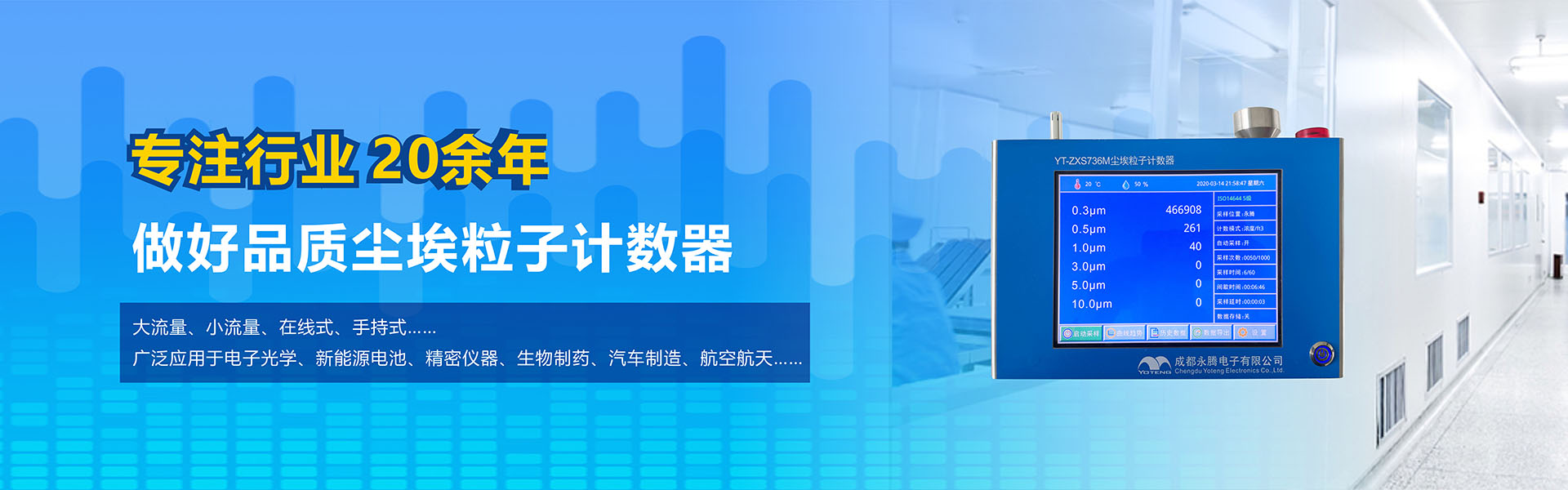成都永騰電子有限公司位于成都市國家經(jīng)濟技術開發(fā)區(qū),是一家專業(yè)從事環(huán)境空氣監(jiān)測儀器研發(fā)、生產(chǎn)、銷售于一體的高科技企業(yè)。產(chǎn)品涵蓋空氣檢測儀器、潔凈間在線塵埃粒子計數(shù)器監(jiān)測系統(tǒng)、大氣顆粒物監(jiān)測微站系統(tǒng)、電化學分析儀器、實驗室設備等產(chǎn)品。